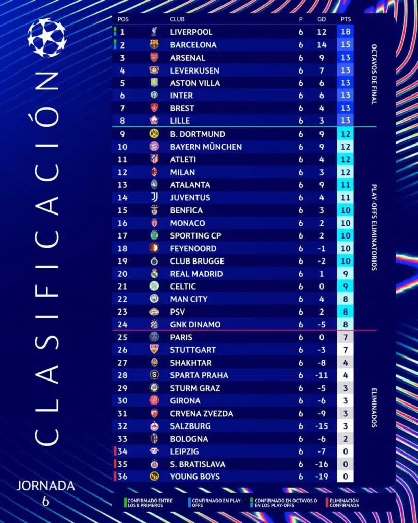 El Liverpool lidera la tabla con 18 puntos, seguido de cerca por el Barcelona con 15. Los «Reds» han tenido un inicio de temporada impecable en la Champions y buscarán mantener su dominio en la Jornada 7.