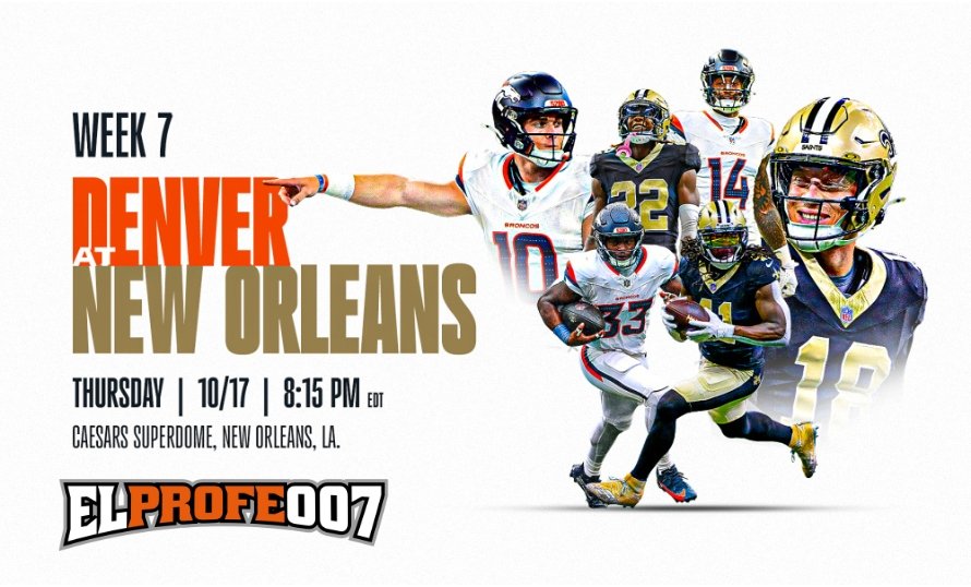 Amigos de «El Profe 007», la semana 7 de la NFL nos trae un enfrentamiento que promete chispas: New Orleans Saints vs. Denver Broncos. Dos equipos con trayectorias distintas en lo que va de temporada, pero con la misma sed de victoria. Los Saints, jugando en casa, buscarán reencontrarse con el triunfo y recuperar la confianza perdida. Por su parte, los Broncos llegan con la ilusión de consolidar su juego y dar un golpe de autoridad en una plaza complicada.