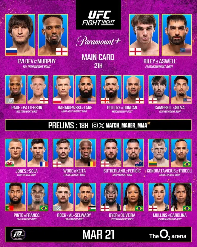 - Estelar (Peso Pluma): Movsar Evloev vs. Lerone Murphy — Duelo de invictos por la cima del ranking.